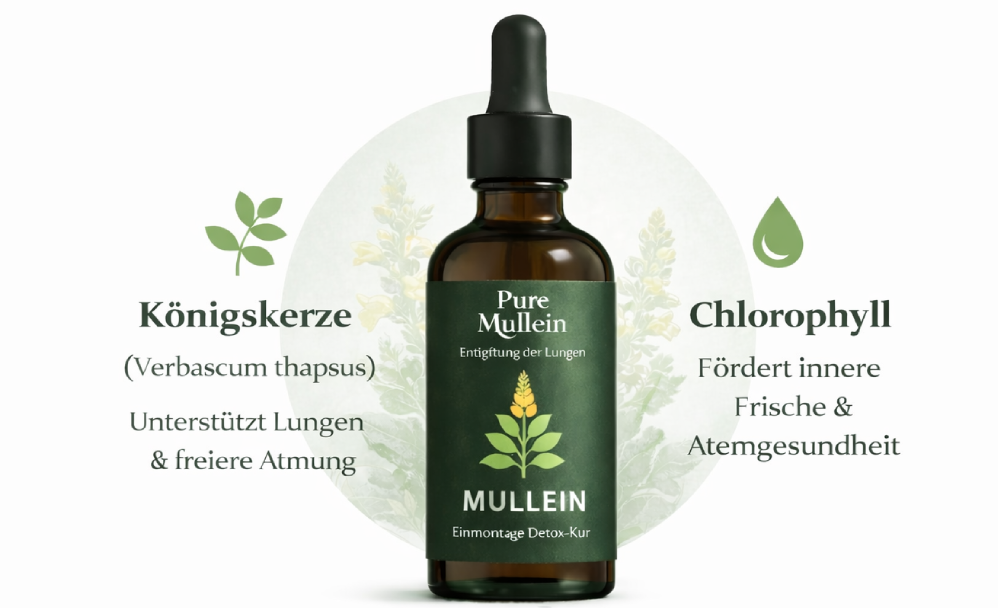 Pure Mullein® wurde speziell für Raucher und Ex-Raucher entwickelt, die sich im Alltag ein angenehmeres Atemgefühl wünschen. Die sanfte, pflanzliche Formel unterstützt den täglichen Atemkomfort und lässt sich einfach und unkompliziert in die Routine integrieren, ganz ohne aggressive Inhaltsstoffe.